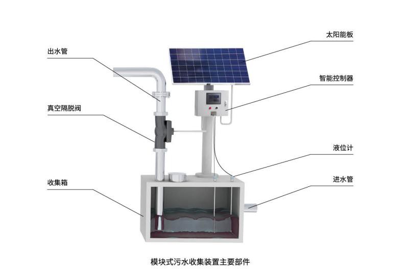 模塊式污水收集裝置是整套負壓排水系統的核心控制元件,也是負壓排水系統得以實現的關鍵設備。模塊式污水收集裝置根據現場情況靈活安裝,設備采用中部進水,上部出水的設計。進水口有四個方向,可根據現場情況靈活調整安裝方式。此設備主要功能是控制收集的污水有序進入負壓管網,無空氣進入。
