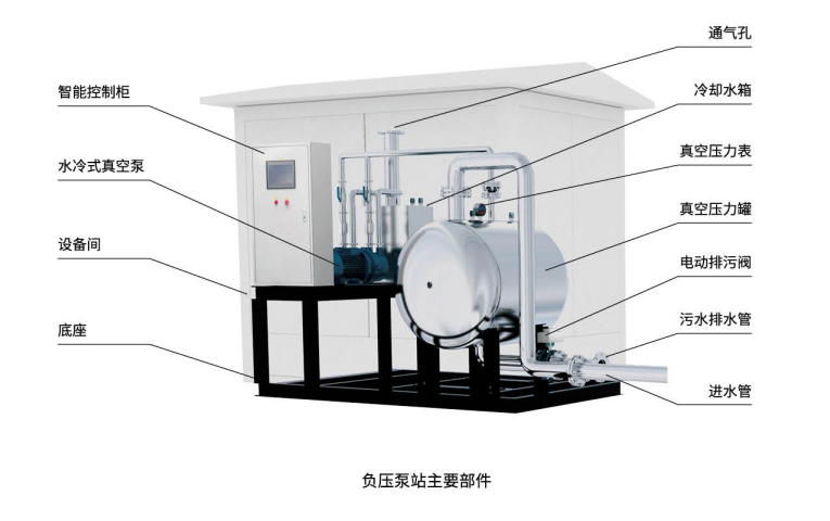 負壓站是負壓排水系統的動力源站,主要由真空壓力罐、真空泵,排污泵、物聯網智慧控制系統組成。收集來的污水在負壓梯度力的輸送作用下經負壓污水管網進入真空壓力罐。當污水收集罐內的污水液位上升到設定值時,排污泵啟動或排污閥打開,將污水排至一體化污水處理設備或市政污水管網。